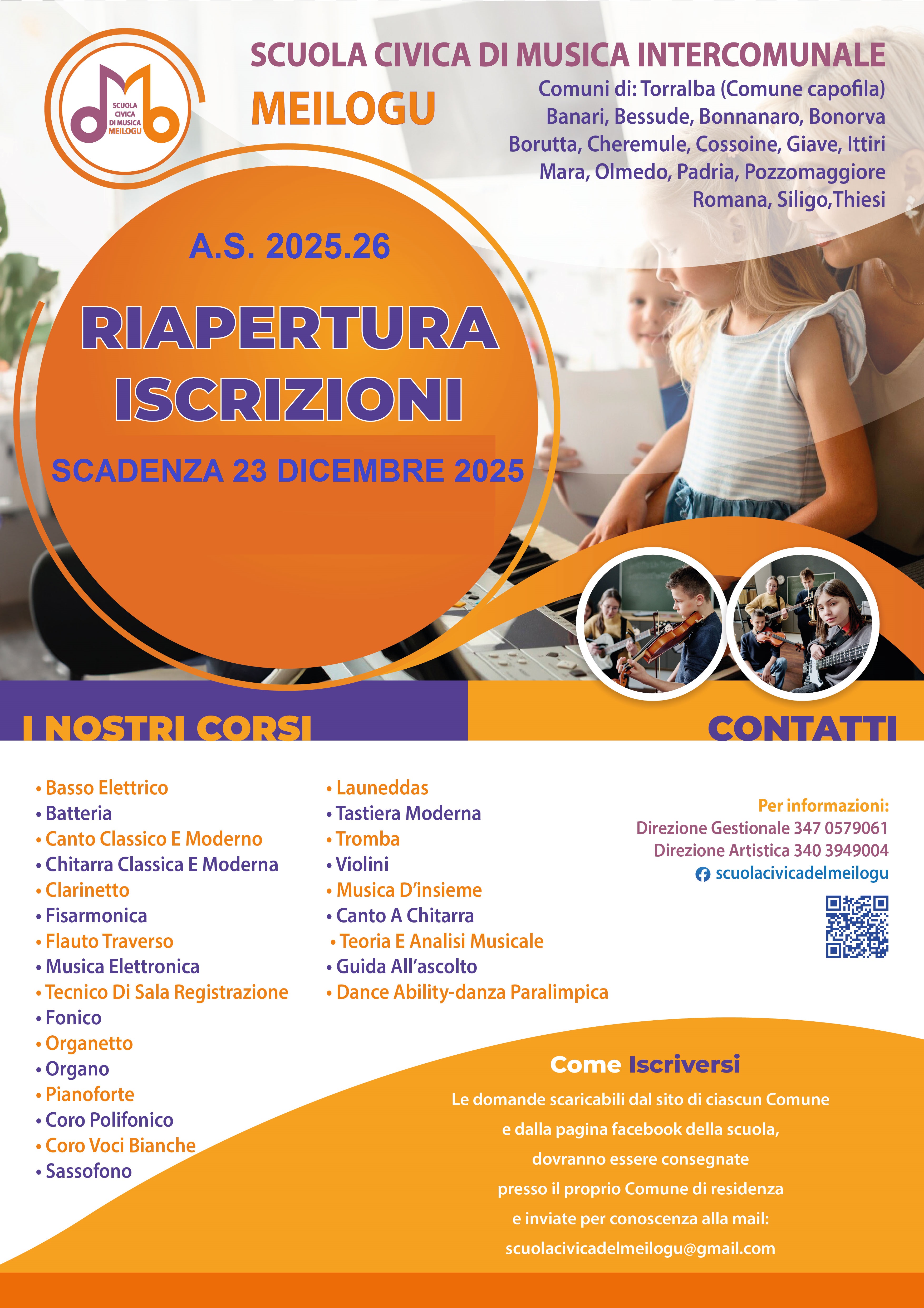 Si informano gli interessati che sono aperte le iscrizioni per l' Anno Scolastico 2025/2026, alla Scuola Civica di Musica Intercomunale Meilogu, di cui il Comune di Ittiri fa parte.